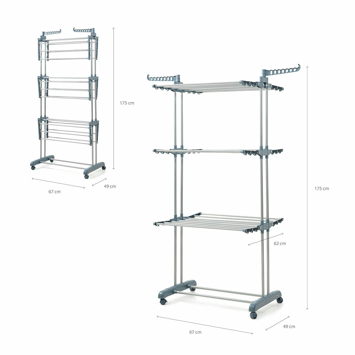 • Suspensions de cintres : cet étendoir à linge à roulettes comprend 2 supports supérieurs mobiles pour suspendre des cintres pour vêtements délicats et éviter ainsi les marques et les plis. Il dispose également de 3 petits crochets latéraux pour cintres au bas de chacun de ses 12 bras. Cintres non inclus.