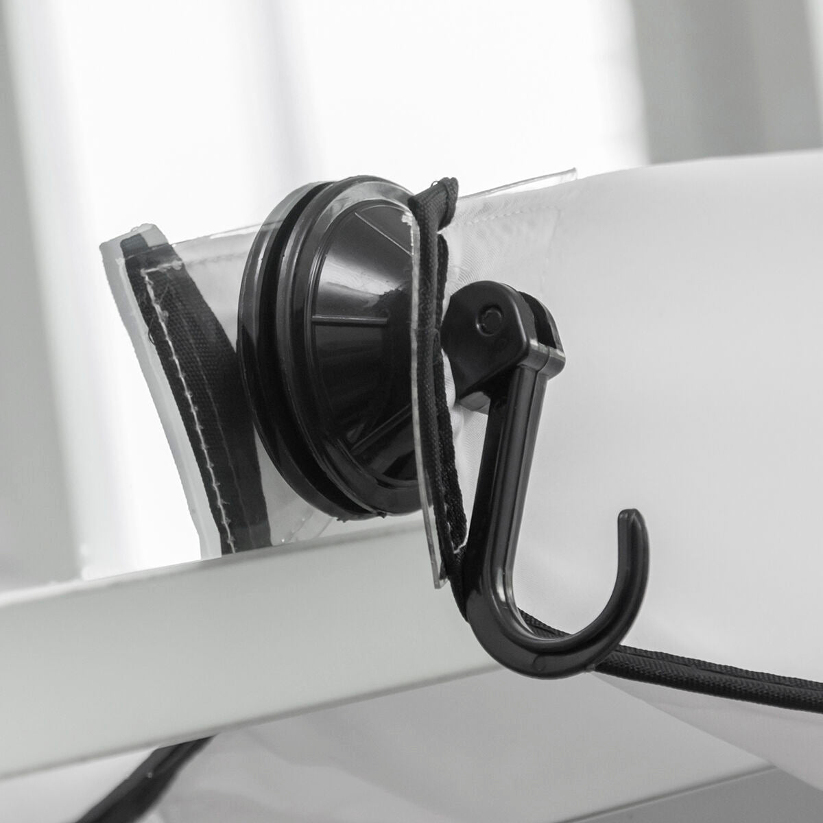 Ce tablier collecteur de poils pour le rasage se place facilement sur le miroir grâce aux crochets avec ventouses de support inclus et s’adapte complètement autour du cou grâce à la fermeture velcro réglable.