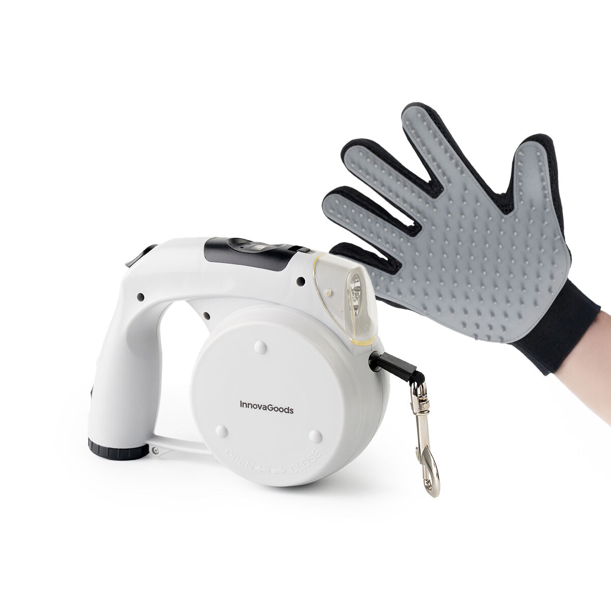 Pack Gant pour Brosser et Masser les Animaux Domestiques et Laisse de chien rétractable 6 en 1 InnovaGoods