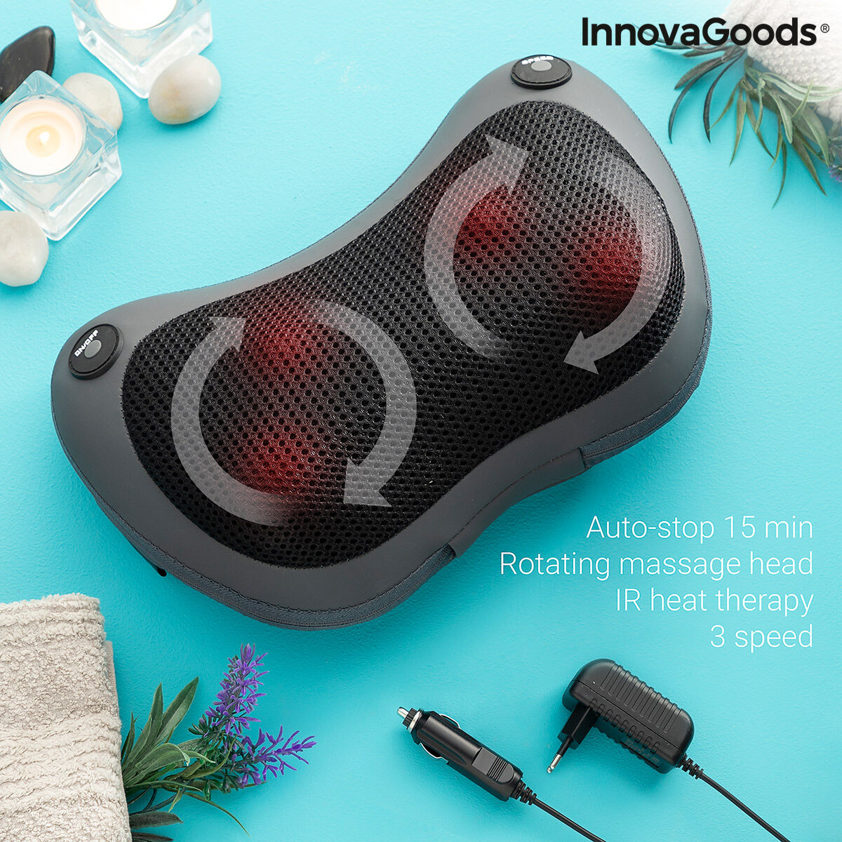 Ce masseur pour le corps de type shiatsu au design moderne et compact est facile à utiliser, à transporter et à ranger, pour un encombrement réduit et une utilisation plus légère et plus confortable. Ce masseur électrique ergonomique est très polyvalent et adaptable, car il convient à un massage général intégral et peut être utilisé n’importe où sur le corps (cou, dos, lombaires, jambes, etc.). Idéal pour combattre le stress en offrant un massage relaxant et réparateur, obtenant un effet agréable de soulagement et de repos. Il est doté de 4 têtes rotatives et bidirectionnelles qui font des mouvements circulaires très utiles, permettant de changer le sens de rotation. Sa fonction de chauffage est indépendante (peut être activée ou non, selon vos besoins) et consiste en une lumière infrarouge qui améliore la sensation apaisante de bien-être. Il est doté d'une fonction d'arrêt automatique et d'une vitesse réglable pour sélectionner le niveau d'intensité souhaité, selon vos besoins et vos préférences. Sa sangle élastique à l’arrière est idéale pour fixer le masseur sur le dos d’une chaise, sur un appuie-tête de voiture, etc. Inclut un adaptateur secteur et un câble adaptateur pour la voiture.