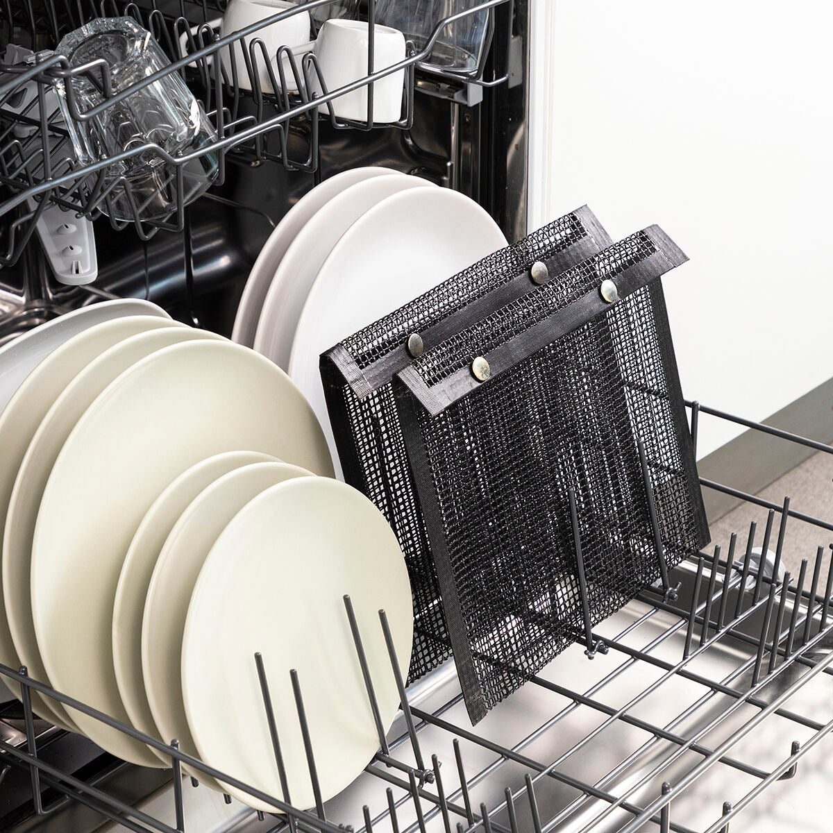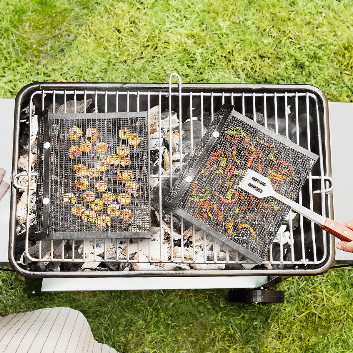 Un ensemble de 2 sacs de cuisson pour barbecue, parfaits pour griller les légumes et autres petits aliments sans qu'ils ne collent ou ne se renversent et ne brûlent. Ils sont très pratiques et faciles à utiliser, il suffit de mettre les aliments dans les sacs et de les placer sur la grille du barbecue (jamais directement au-dessus des flammes). Les aliments cuisent mieux et ont meilleur goût, car la fumée passe à travers les mailles. Il suffit de retourner les sacs pour faire cuire de l'autre côté. Comme les aliments se trouvent à l'intérieur des sacs, ils ne se dispersent pas et ne tombent pas pendant la cuisson. Une fois cuits, ils sont faciles à retirer grâce au matériau antiadhésif. De plus, les sacs se nettoient facilement au lave-vaisselle. Une méthode plus hygiénique et plus efficace pour cuire les aliments au barbecue.