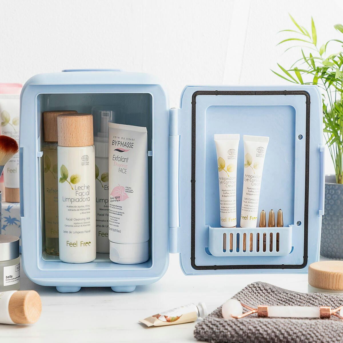 The Frecos InnovaGoods mini cosmetics fridge is ideal for keeping a wide variety of cosmetic products cool and in optimum condition, such as creams, masks and facial ampoules, serums, eye contour creams, body creams, face mists and sprays, rollers and stones, organic beauty products with natural ingredients, etc. Its cooling function is also ideal for refrigerating drinks, medications, etc.