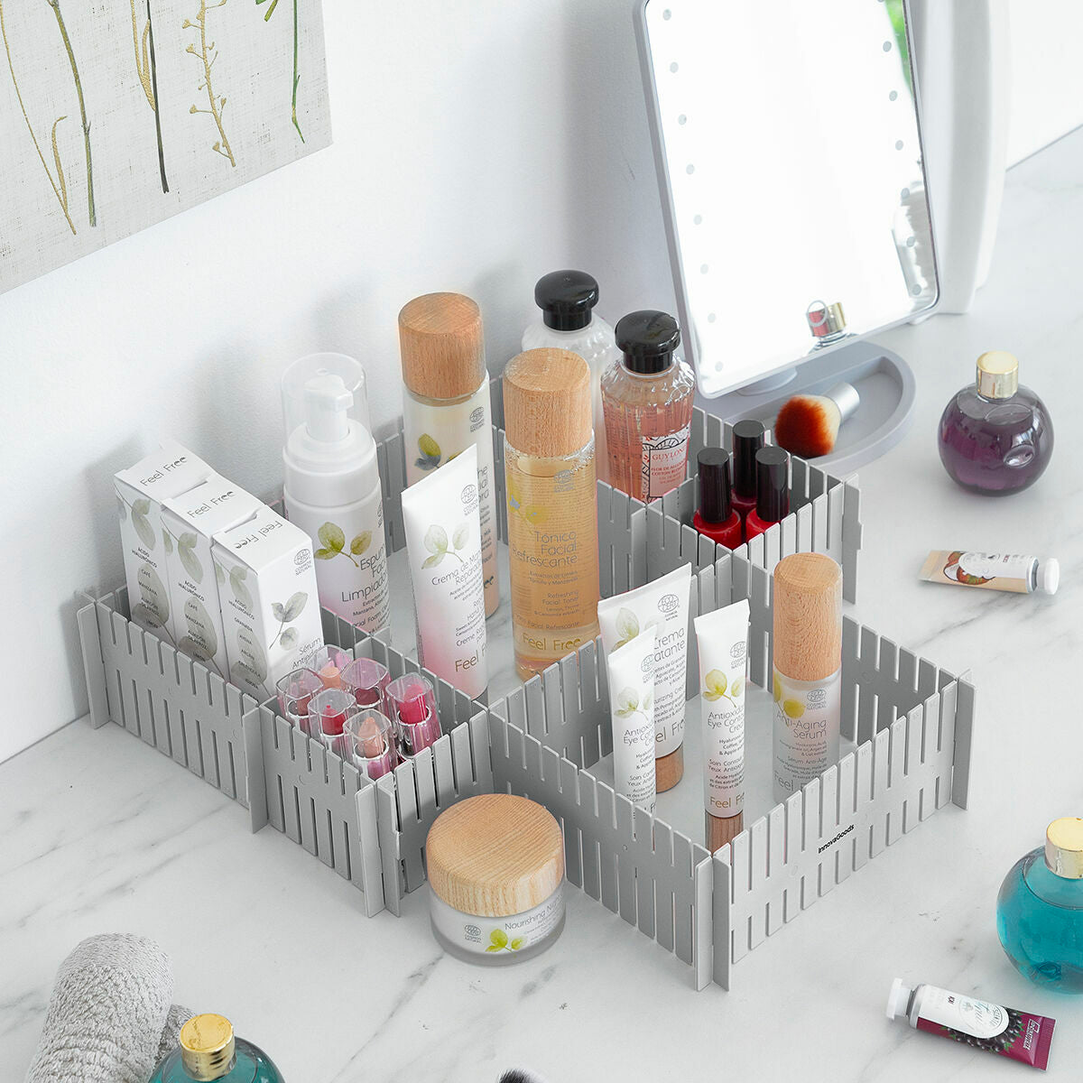 This adjustable drawer organiser adapts perfectly to different dimensions and spaces, according to your needs. It includes instructions for use in order to place it correctly in various positions. The16 units included can be cut and joined together perpendicularly to fully fit the desired space. They can also be positioned vertically.