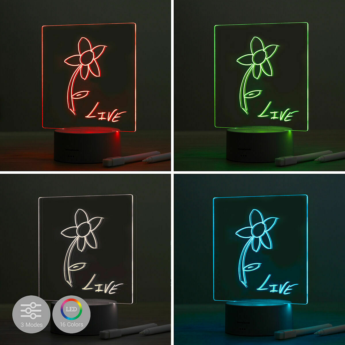 An LED note and message board that is ideal for all types of notes. Includes 2 markers, eraser, remote control and USB cable. It has a touch button for turning it on/off and a RGB LED with 16 colours, 5 light modes and adjustable intensity.