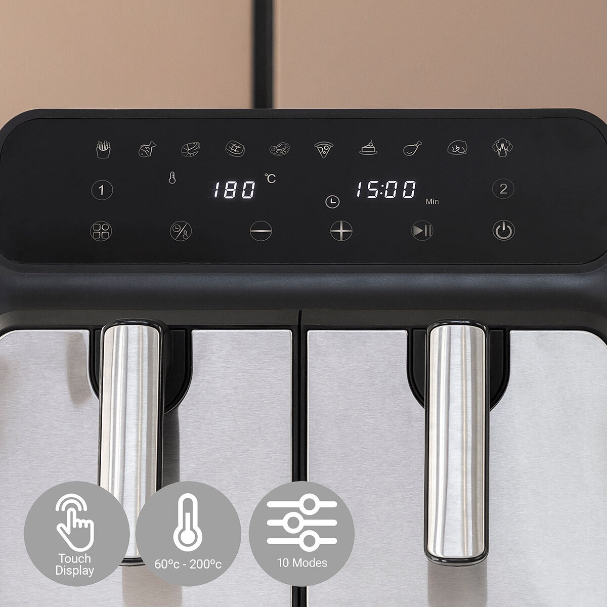 - Moderne et polyvalente : Notre friteuse dispose de 2 paniers indépendants avec une capacité de 4 L chacun qui permettent 2 zones de cuisson séparées pour des recettes différentes. A potência de 3 400 W permite cozinhar pratos deliciosos.